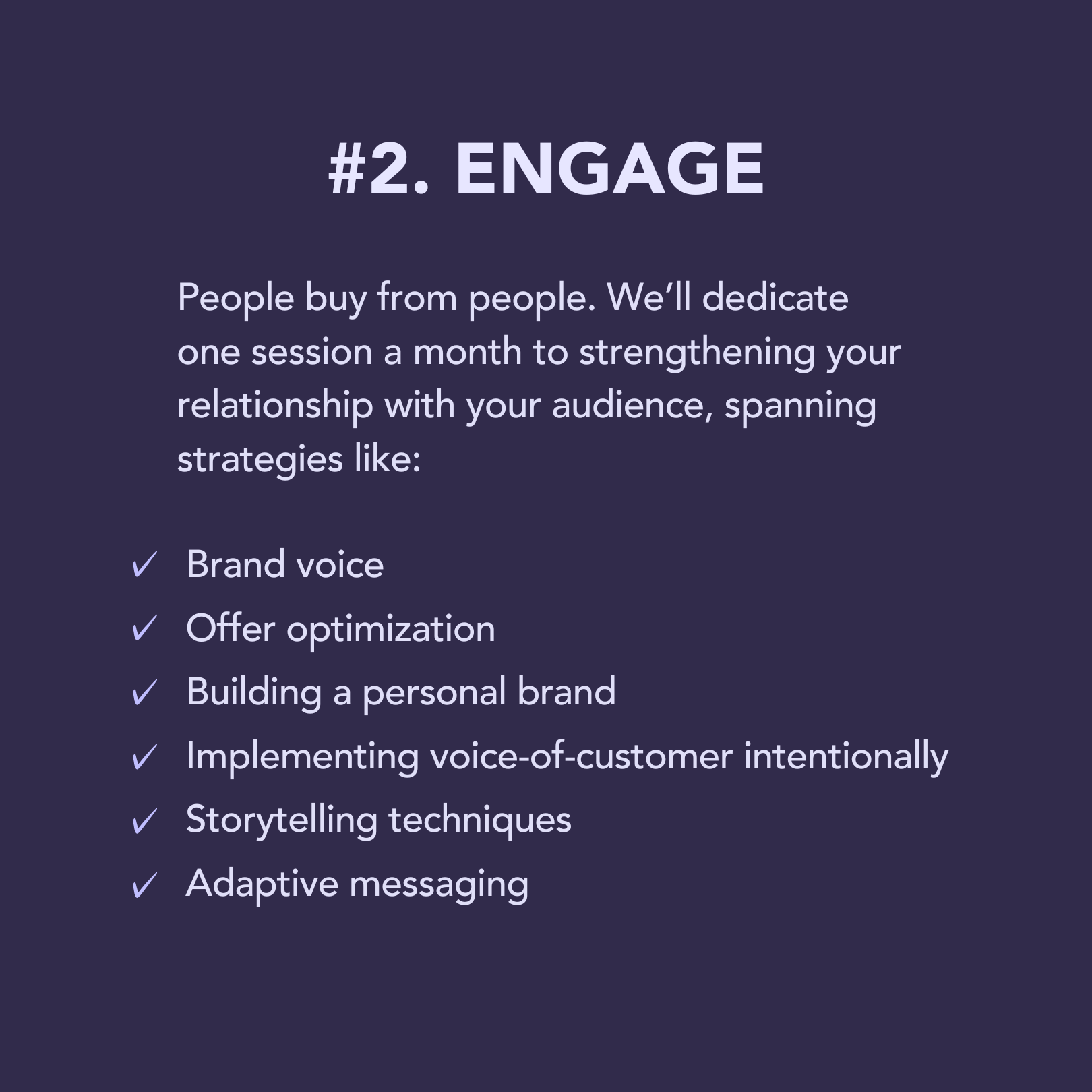 Evergreen funnels convert 10X better when they have ONE compelling idea running through the entire funnel. This is the piece the Don Drapers of the world excel at, but struggle to put into words. Which is why we’ll spend the first month working through a structured process to find your big idea. Then we’ll craft that idea into the 10X message you’ll double down on everywhere you show up online.
