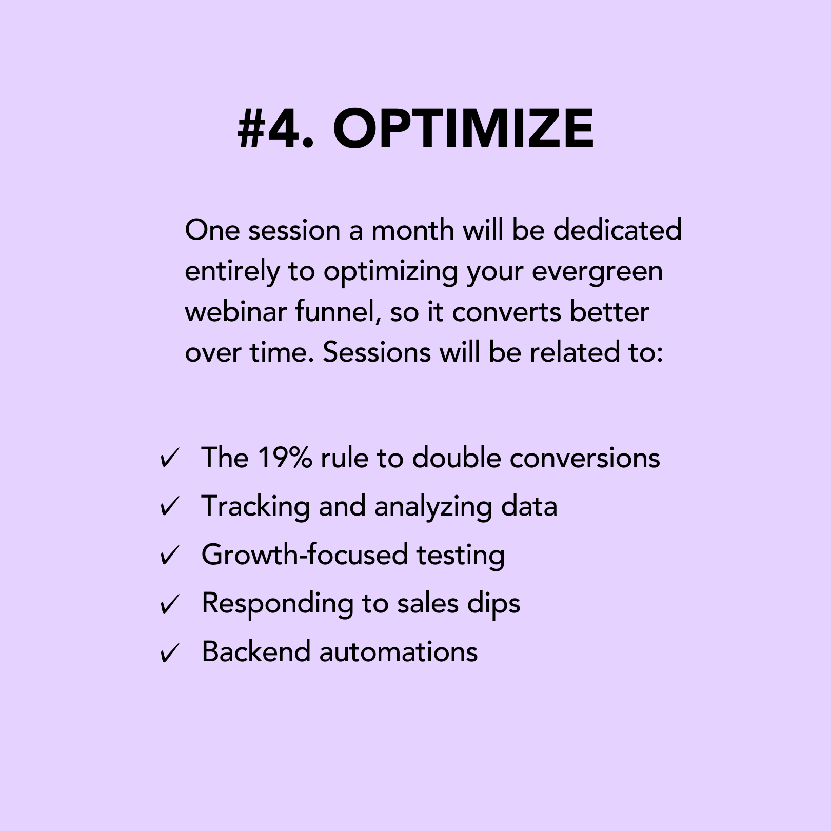 First, you need a high-converting evergreen webinar funnel built around your most profitable message. Then, you need ongoing data-driven optimization so every new wave of traffic performs better than the last.