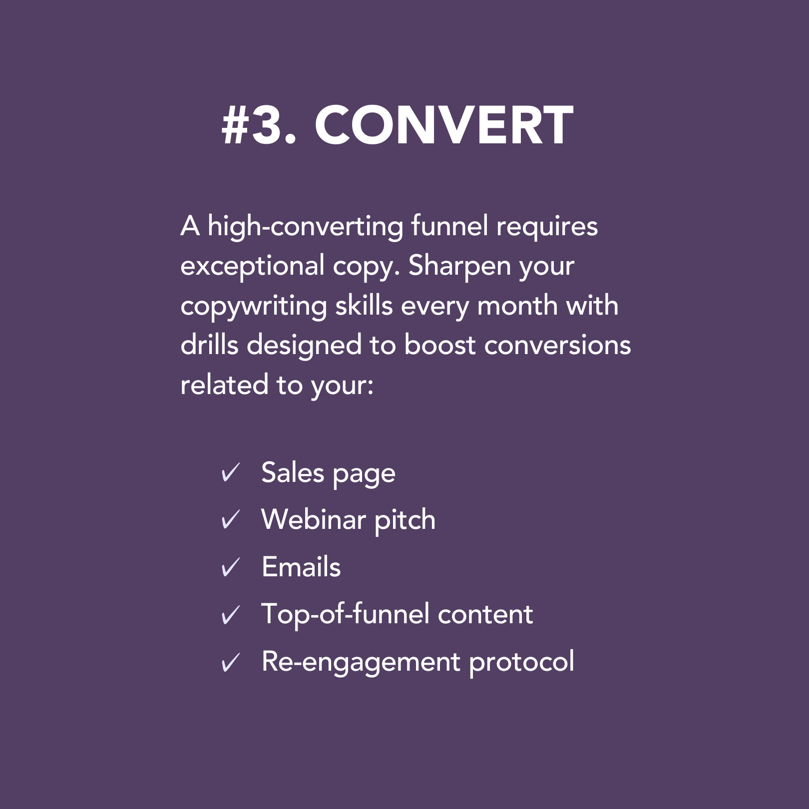 Each week, you can submit an asset for us to review (e.g. an opt-in, sales pages, emails). You’ll get conversion-focused feedback from me or one of my in-house copywriting experts.